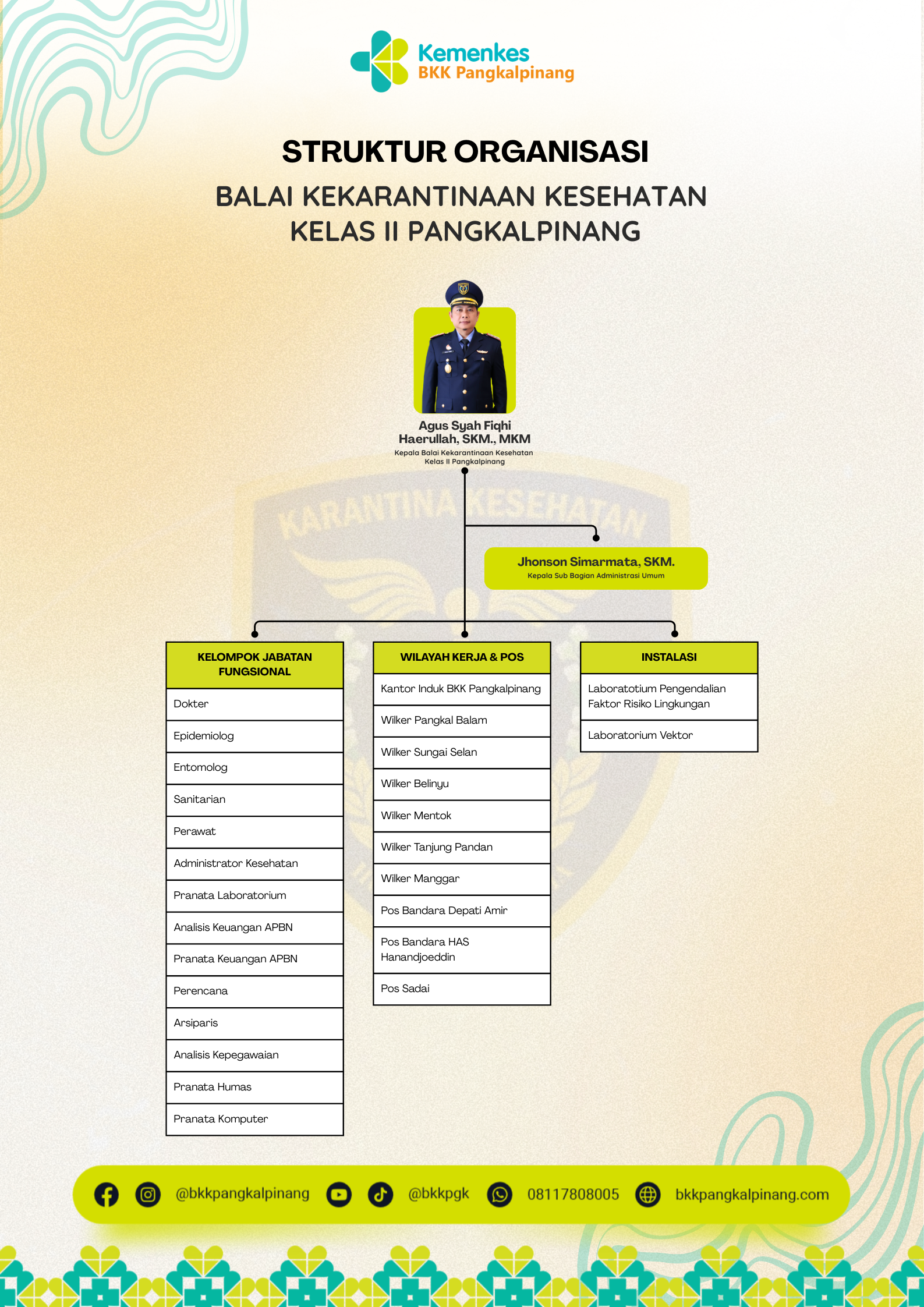 Balai Kerantinaan Kesehatan Kelas II Pangkalpinang merupakan salah satu Unit Pelaksana Teknis (UPT) Kementerian Kesehatan yang berada dibawah dan bertanggung jawab kepada Direktur Jenderal Pencegahan dan Pengendalian Penyakit Kementerian Kesehatan. Sesuai Peraturan Menteri Kesehatan No 10 Tahun 2023 tentang Organisasi dan Tata Kerja Unit Pelaksana Teknis Bidang Kekarantinaan Kesehatan.
